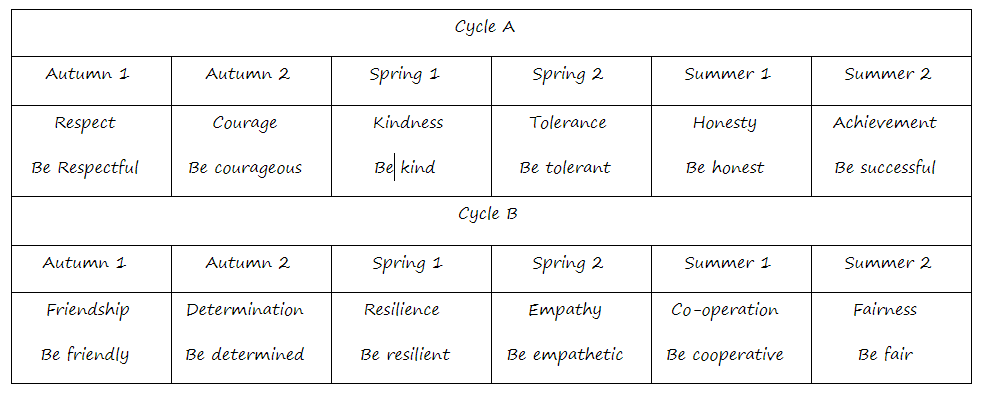 The values we values we focus on are: Respect, Happiness, Knowledge, Kindness, Honesty, Achievement, Friendship, Determination, Love, Empathy, Co-operation, Fairness. These are at times addressed directly through lessons and assemblies but also permeate the whole curriculum. Either way, they are the basis for the social, intellectual, emotional, spiritual and moral development of the whole child. We encourage children to consider these values, and thereby to develop the knowledge, skills and attitudes that enable them to develop as reflective learners and grow to be stable, educated and civil adults.